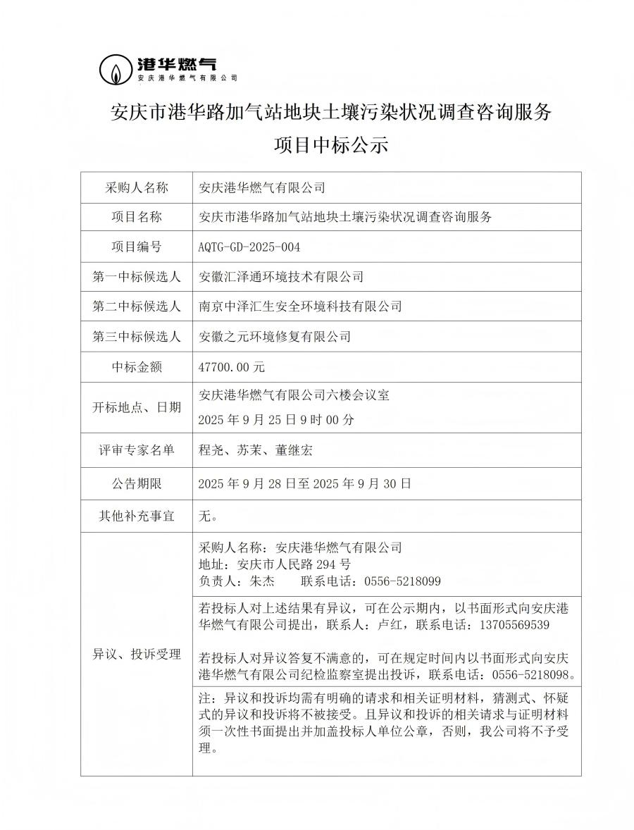 安庆市港华路加气站地块土壤污染状况调查咨询服务项目中标公示