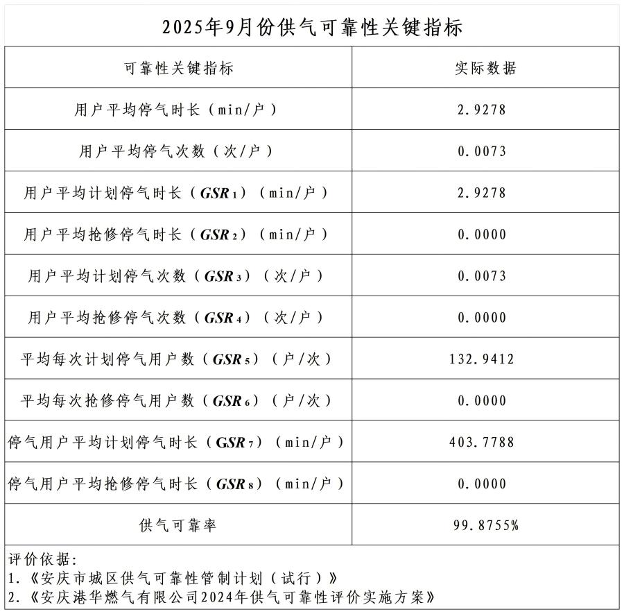 2025年9月份供气可靠性关键指标