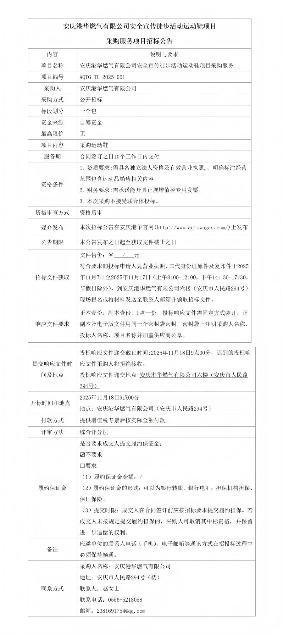 安庆港华燃气有限公司安全宣传徒步活动运动鞋项目采购服务项目招标公告