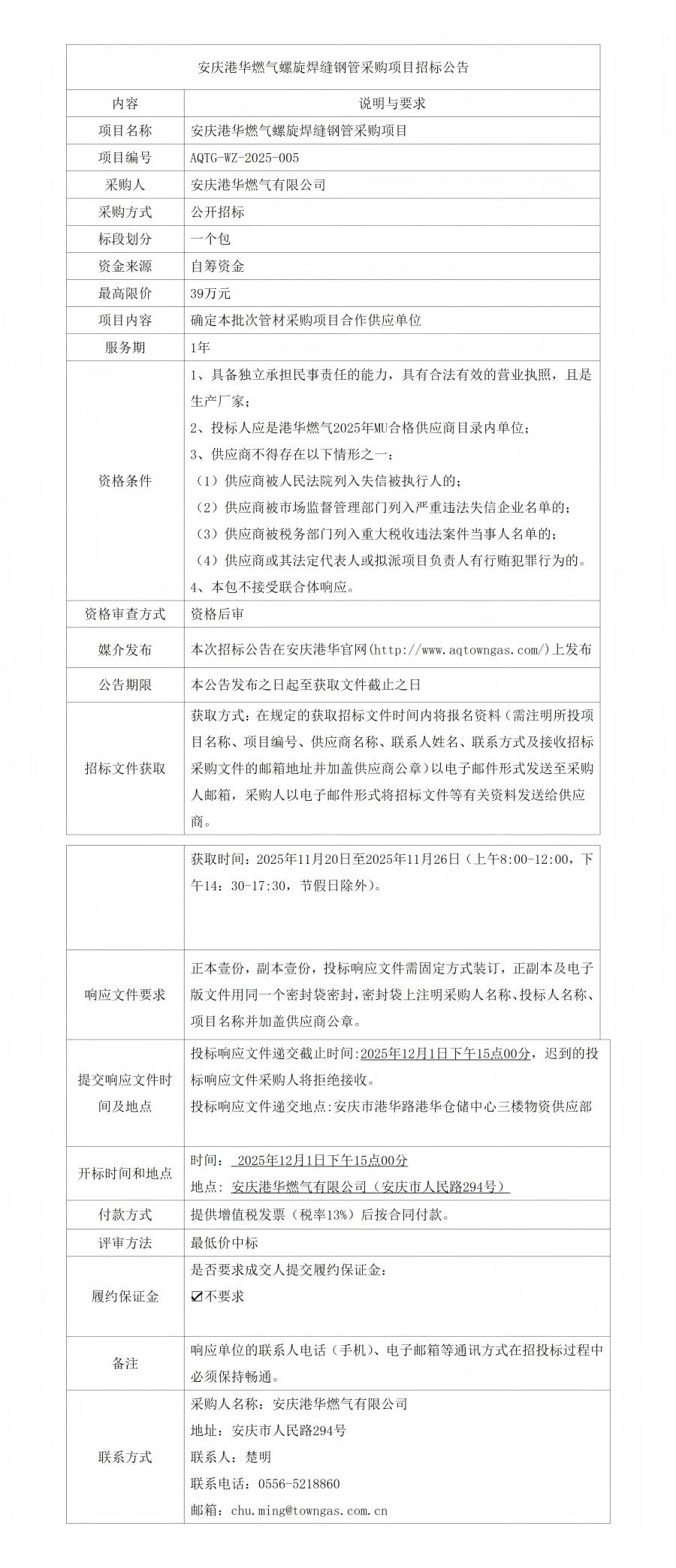 安庆港华燃气螺旋焊缝钢管采购项目招标公告