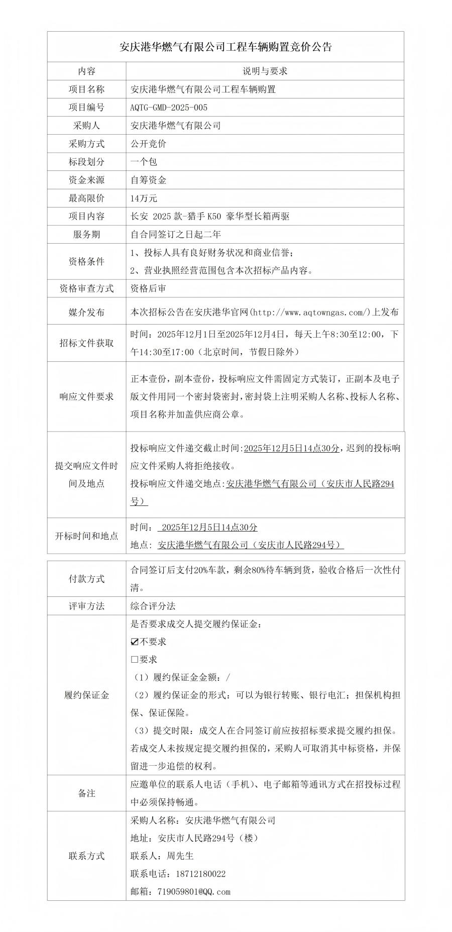 安庆港华燃气有限公司工程车辆购置竞价公告