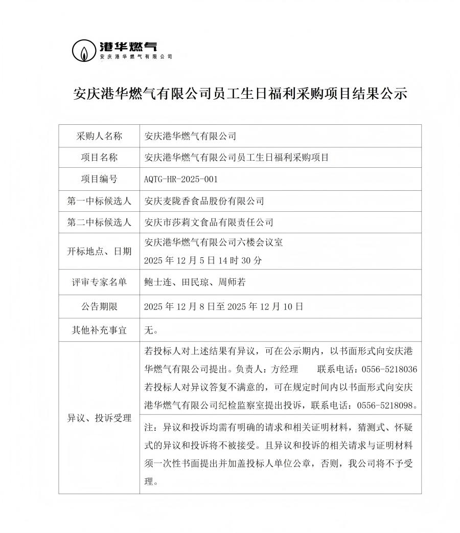安庆港华燃气有限公司员工生日福利采购项目结果公示