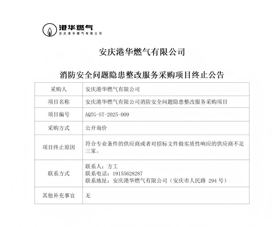 安庆港华燃气有限公司消防安全问题隐患整改服务采购项目终止公告