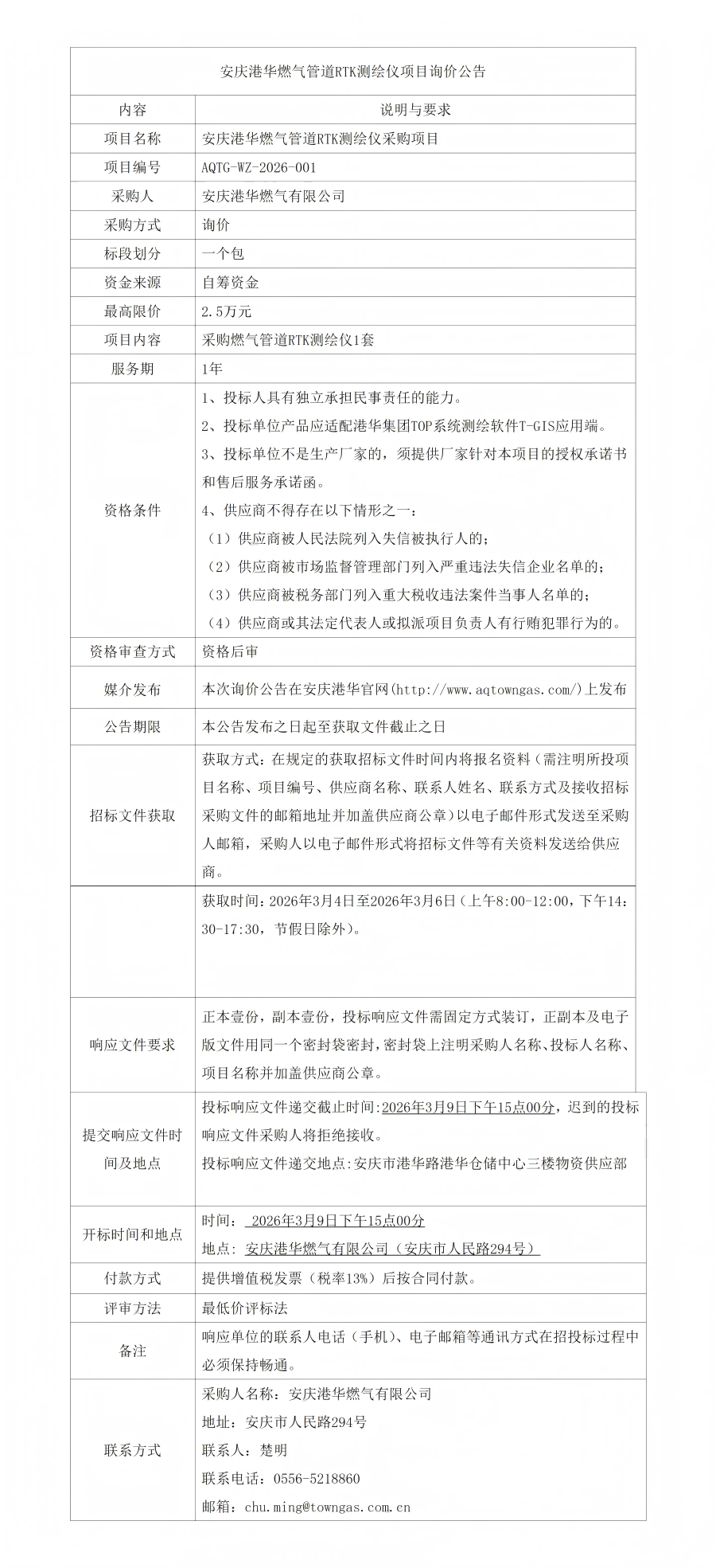 安庆港华燃气管道RTK测绘仪项目询价公告
