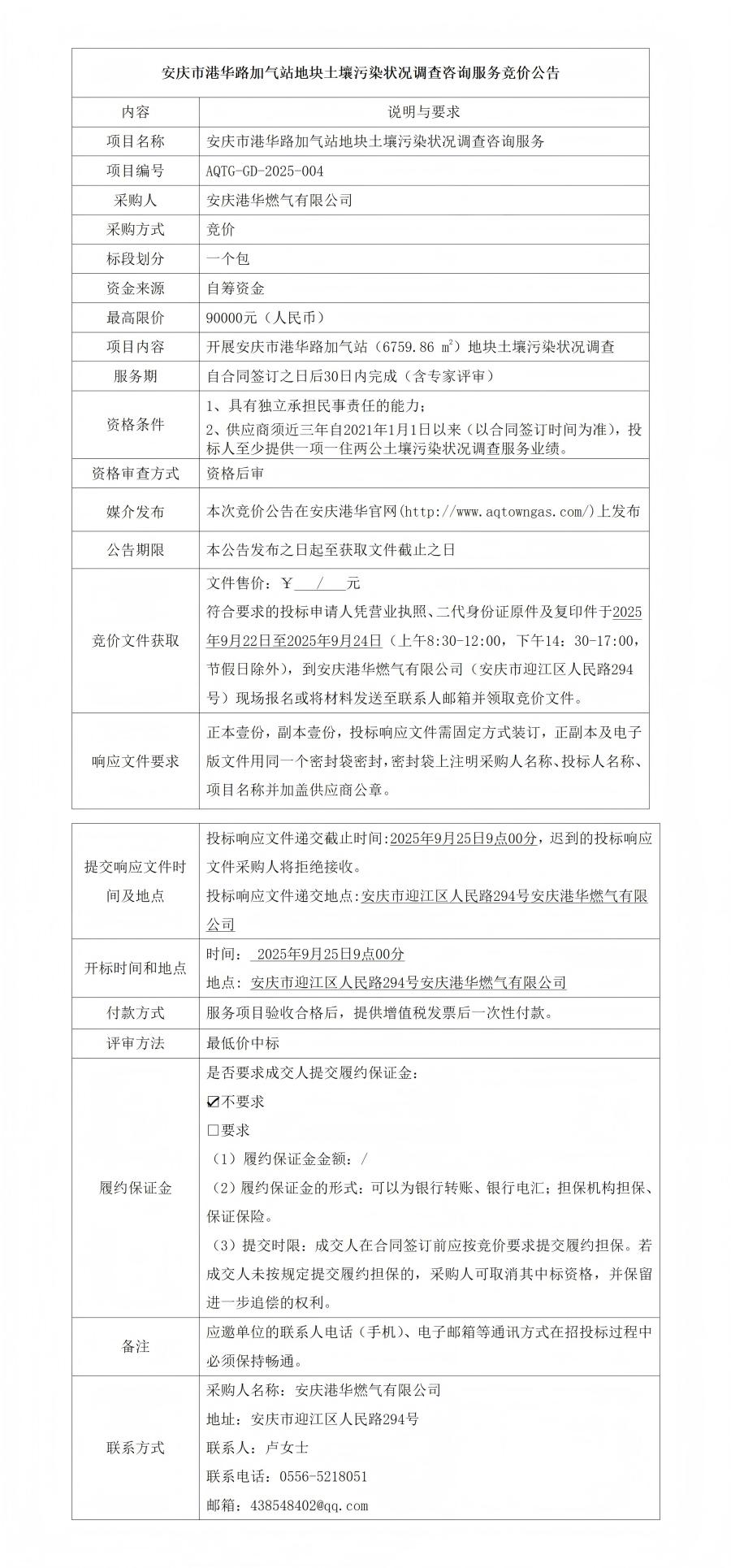 安庆市港华路加气站地块土壤污染状况调查咨询服务竞价公告