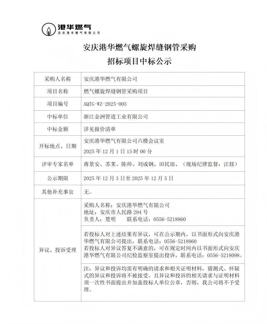 安庆港华燃气螺旋焊缝钢管采购招标项目中标公示