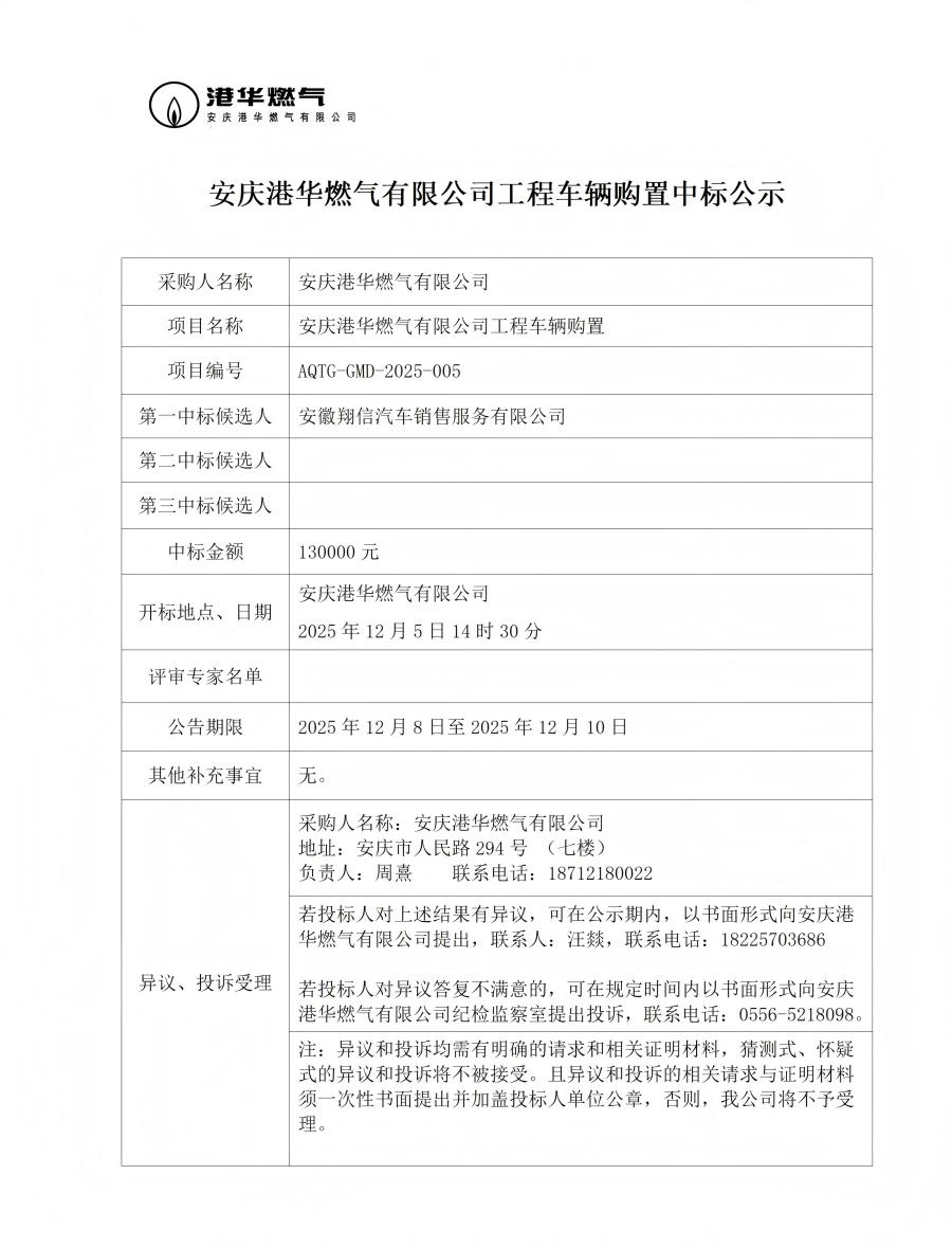 安庆港华燃气有限公司工程车辆购置中标公示