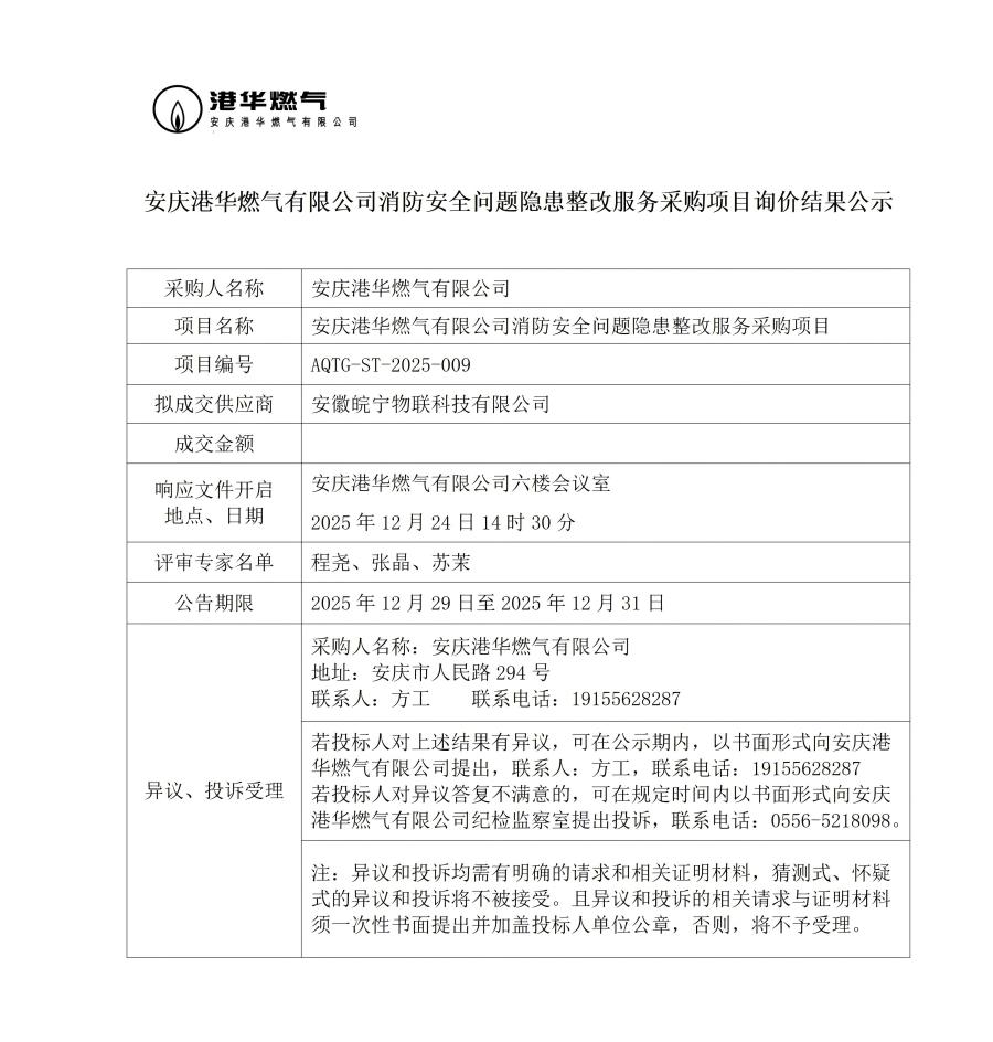 安庆港华燃气有限公司消防安全问题隐患整改服务采购项目询价结果公示